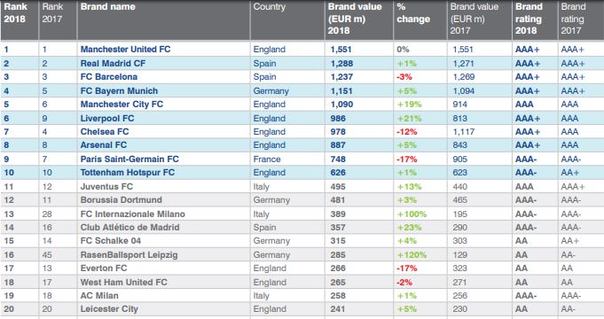 Una crescita del 100% rispetto al 2017. Il brand dell’Inter, secondo uno studio di Brand Finance, è balzato dal 28esimo posto al 13esimo in questa particolare classifica che calcola il valore del marchio dei primi cinquanta club europei. Nel 2017 si parlava di un valore di 195 mln di euro. Adesso si parla di un valore di 389 mln. Notevole la rimonta sulla Juventus, con un distacco sceso da 245 milioni a soli 106 milioni.