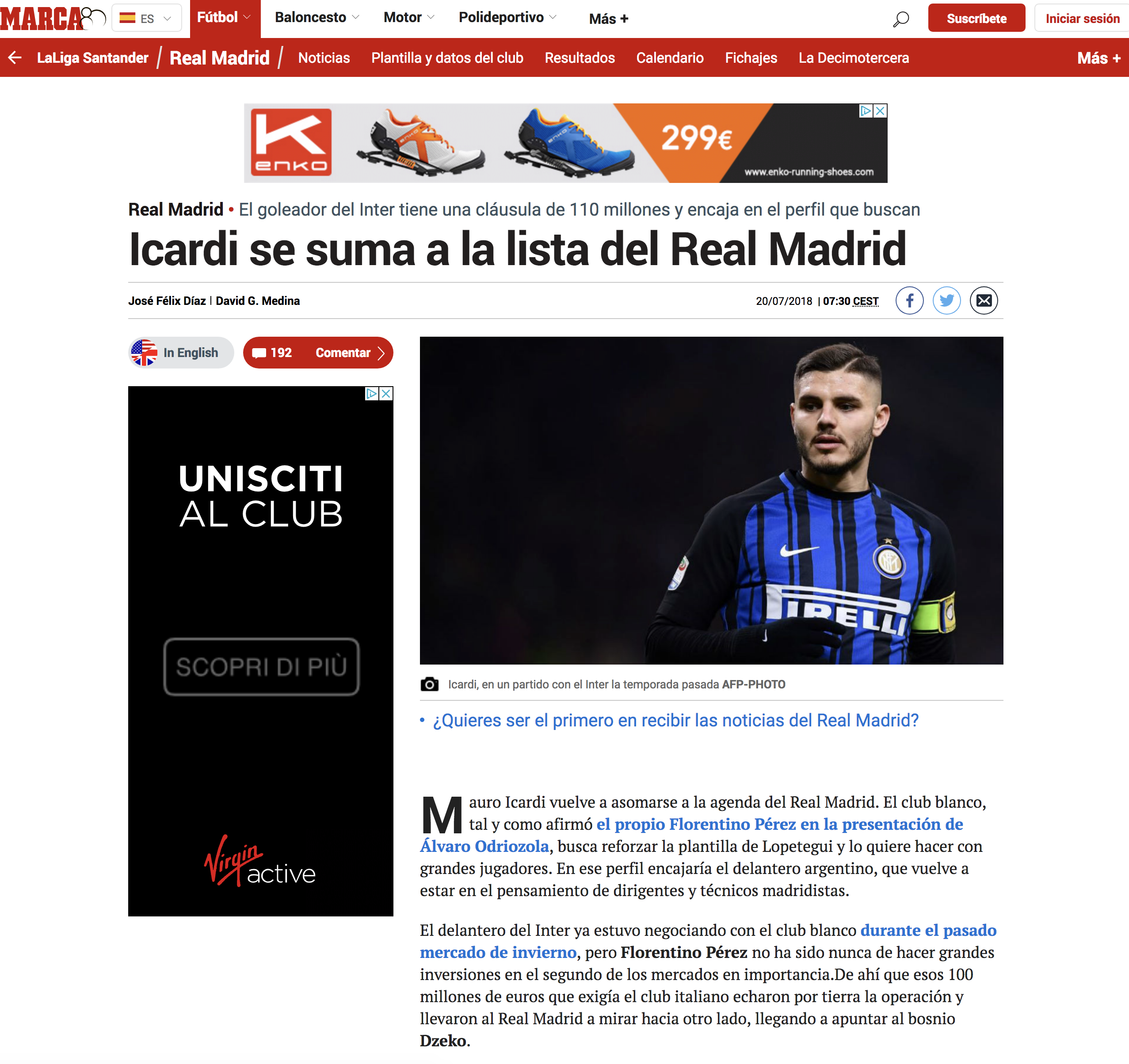 GRANDI GIOCATORI – Come riferisce la versione online di MarcaMauro Icardi torna nell’agenda del Real Madrid. Il club Blancos, come dichiarato dallo stesso Florentino Perez nella presentazione di Alvaro Odriozola, cerca di rafforzare la rosa a disposizione di Lopetegui e vuole farlo con grandi giocatori. In questo senso, sarebbe adatto l’attaccante argentino, che è di nuovo nei pensieri dei vertici e del tecnico del Real Madrid. L’attaccante dell’Inter era stato cercato dai Blancos nella sessione invernale, ma Florentino Perez non ha mai fatto investimenti importanti nelle seconde sessioni di mercato. Quindi, quei 100 milioni di euro richiesti in precedenza dall’Inter portarono il Real Madrid a guardare da un’altra parte, arrivando a indicare anche il bosniaco della Roma Dzeko”.