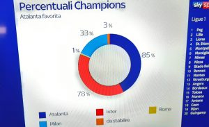 Skysport ha costruito un diagramma con le percentuali che rappresentano le possibilità delle formazioni ancora in corsa di centrare l’obiettivo qualificazione e il club bergamasco ha nell’ultima giornata di campionato l’85% di possibilità di entrare in Coppa.